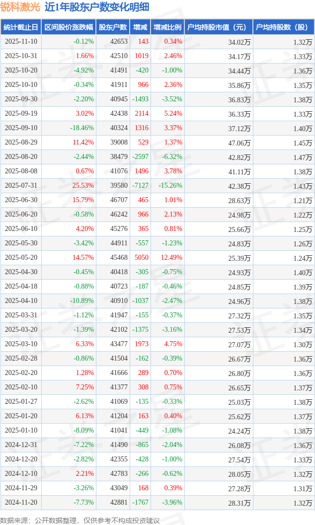 从股价来看,2025年10月31日至2025年11月10日,锐科激光区间跌幅为0.12%,在此期间股东户数增加143.0户,增幅为0.34%。