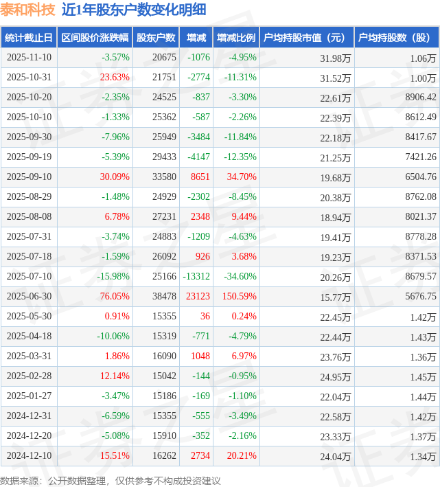 从股价来看,2025年10月31日至2025年11月10日,泰和科技区间跌幅为3.57%,在此期间股东户数减少1076.0户,减幅为4.95%。