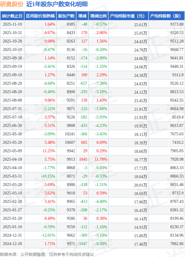 从股价来看,2025年10月31日至2025年11月10日,研奥股份区间涨幅为1.64%,在此期间股东户数减少48.0户,减幅为0.57%。
