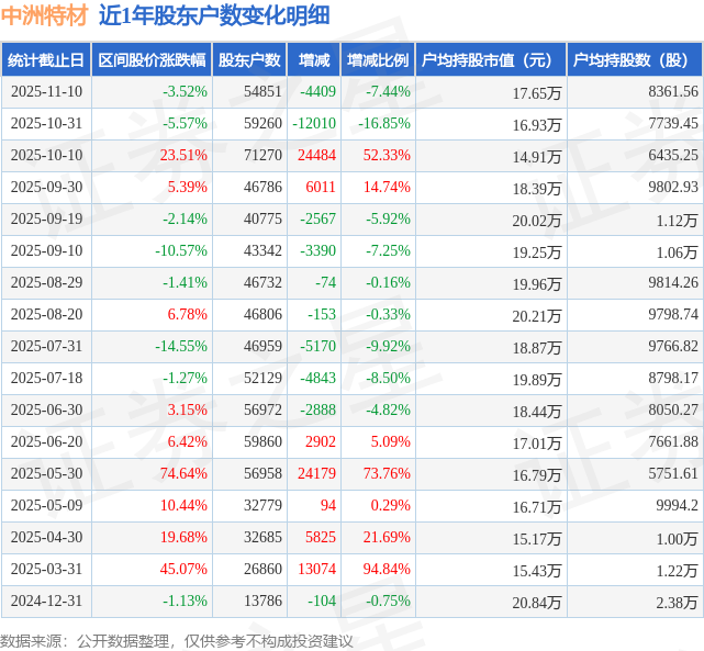 从股价来看,2025年10月31日至2025年11月10日,中洲特材区间跌幅为3.52%,在此期间股东户数减少4409.0户,减幅为7.44%。
