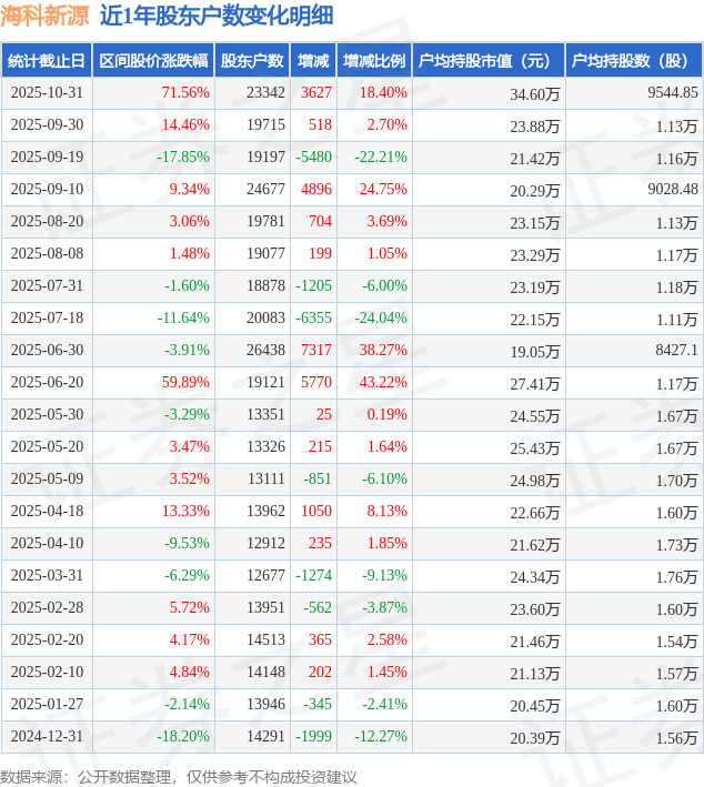 从股价来看,2025年9月30日至2025年10月31日,海科新源区间涨幅为71.56%,在此期间股东户数增加3627.0户,增幅为18.4%。