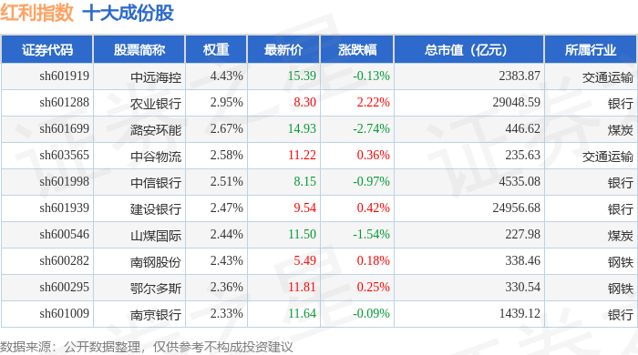 证券之星消息,11月11日,红利指数(000015)报收于3200.85点,跌0.26%,成交241.25亿元,换手率0.21%。当日该指数成份股中,上涨的有23家,农业银行以2.22%的涨幅领涨,下跌的有26家,兖矿能源以3.62%的跌幅领跌。