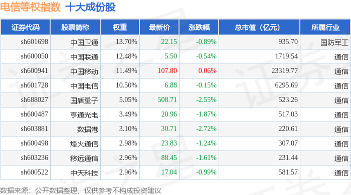 电信等权(000078)指数十大成份股详情如下: