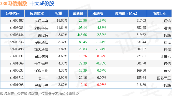 资金流向方面,380电信(000112)指数成份股当日主力资金净流出合计6.61亿元,游资资金净流入合计5.01亿元,散户资金净流入合计1.6亿元。成份股资金流向详情见下表: