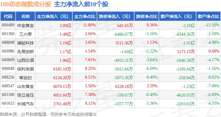 资金流向方面,180动态(000123)指数成份股当日主力资金净流出合计99.59亿元,游资资金净流入合计35.72亿元,散户资金净流入合计63.87亿元。成份股资金流向详情见下表: