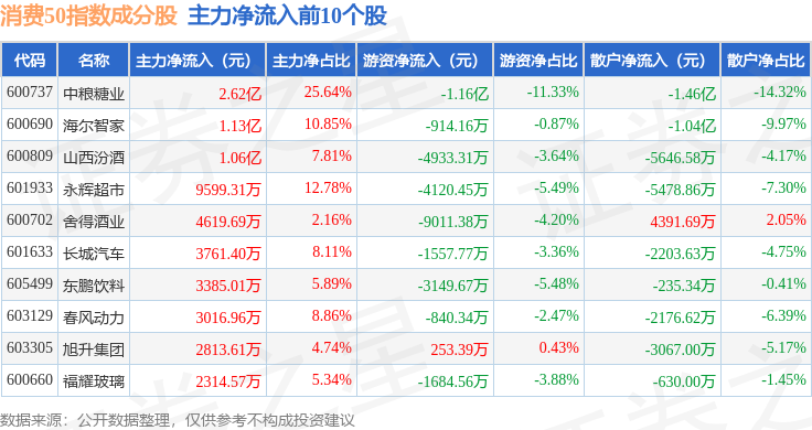 资金流向方面,消费50(000126)指数成份股当日主力资金净流出合计24.22亿元,游资资金净流入合计7.74亿元,散户资金净流入合计16.48亿元。成份股资金流向详情见下表: