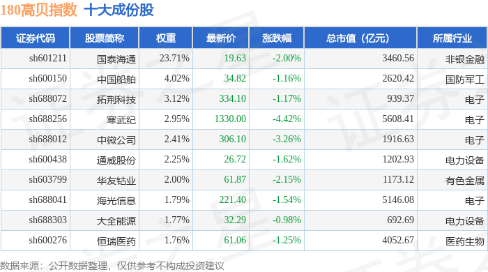 证券之星消息,11月11日,180高贝(000135)指数报收于6256.92点,跌1.43%,成交1134.45亿元,换手率0.8%。当日该指数成份股中,上涨的有6家,中国中免以4.19%的涨幅领涨,下跌的有53家,寒武纪以4.42%的跌幅领跌。