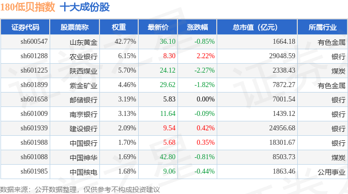 证券之星消息,11月11日,180低贝(000136)指数报收于13259.94点,跌0.55%,成交471.34亿元,换手率0.23%。当日该指数成份股中,上涨的有19家,农业银行以2.22%的涨幅领涨,下跌的有35家,兖矿能源以3.62%的跌幅领跌。
