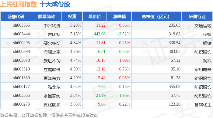 证券之星消息,11月11日,上民红利(000153)指数报收于3244.66点,跌0.09%,成交44.29亿元,换手率0.94%。当日该指数成份股中,上涨的有20家,武进不锈以1.09%的涨幅领涨,下跌的有10家,梅花生物以3.54%的跌幅领跌。