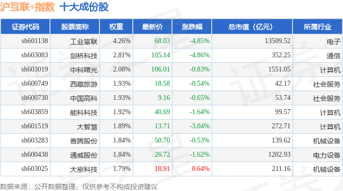 证券之星消息,11月11日,沪互联+(000162)指数报收于3698.48点,跌0.81%,成交587.81亿元,换手率1.03%。当日该指数成份股中,上涨的有24家,恒银科技以5.33%的涨幅领涨,下跌的有46家,亿嘉和以7.43%的跌幅领跌。