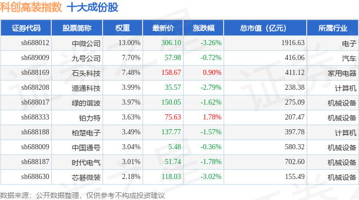 科创高装(000687)指数十大成份股详情如下: