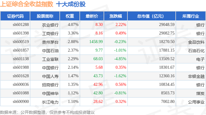 证券之星消息,11月11日,上证综合全收益(000888)指数报收于4570.16点,跌0.39%,成交8583.62亿元,换手率1.23%。当日该指数成份股中,上涨的有1097家,神工股份以20.0%的涨幅领涨,下跌的有1062家,海天股份以10.03%的跌幅领跌。