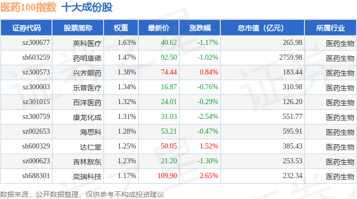 证券之星消息,11月11日,医药100(000978)指数报收于11292.33点,跌0.03%,成交363.94亿元,换手率1.1%。当日该指数成份股中,上涨的有46家,以岭药业以6.61%的涨幅领涨,下跌的有53家,九安医疗以2.78%的跌幅领跌。