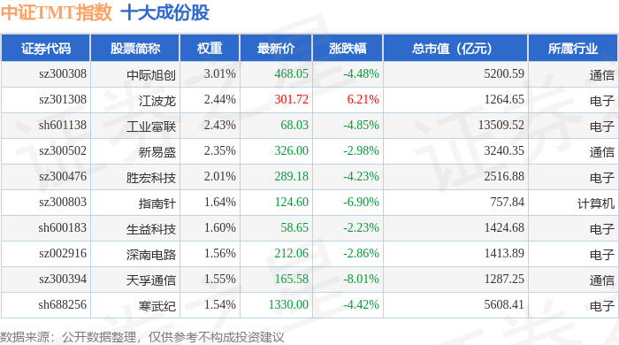证券之星消息,11月11日,中证TMT(000998)指数报收于2863.61点,跌1.97%,成交2356.66亿元,换手率1.32%。当日该指数成份股中,上涨的有11家,江波龙以6.21%的涨幅领涨,下跌的有88家,天孚通信以8.01%的跌幅领跌。