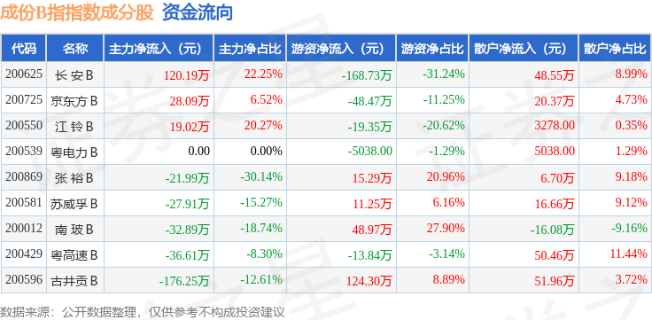 资金流向方面,成份B指(399003)指数成份股当日主力资金净流出合计128.35万元,游资资金净流出合计51.09万元,散户资金净流入合计179.44万元。成份股资金流向详情见下表: