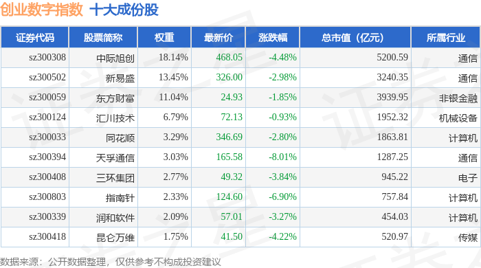 证券之星消息,11月11日,创业数字(399263)指数报收于3009.54点,跌2.54%,成交1012.49亿元,换手率3.11%。当日该指数成份股中,上涨的有9家,江波龙以6.21%的涨幅领涨,下跌的有40家,天孚通信以8.01%的跌幅领跌。