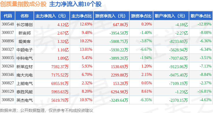 资金流向方面,创质量(399269)指数成份股当日主力资金净流出合计56.54亿元,游资资金净流入合计19.43亿元,散户资金净流入合计37.1亿元。成份股资金流向详情见下表: