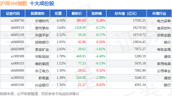 沪深300(399300)指数十大成份股详情如下: