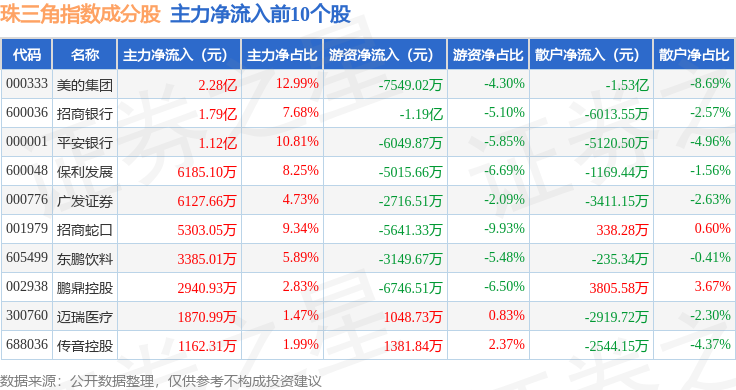 资金流向方面,珠三角(399356)指数成份股当日主力资金净流出合计52.98亿元,游资资金净流入合计6.27亿元,散户资金净流入合计46.71亿元。成份股资金流向详情见下表: