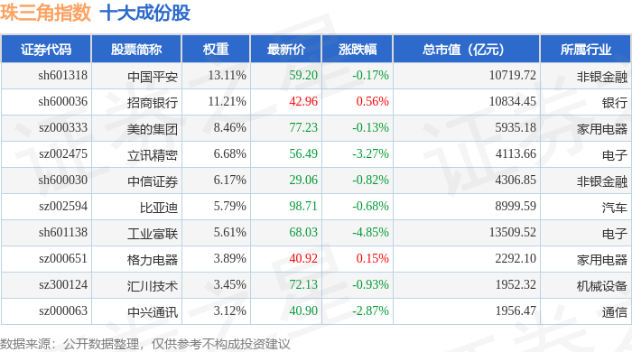 珠三角(399356)指数十大成份股详情如下: