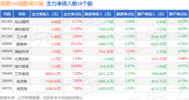 资金流向方面,消费100(399364)指数成份股当日主力资金净流出合计164.03亿元,游资资金净流入合计42.71亿元,散户资金净流入合计121.32亿元。成份股资金流向详情见下表: