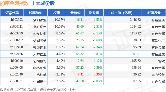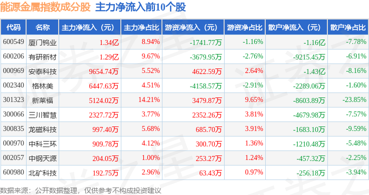 资金流向方面,能源金属(399366)指数成份股当日主力资金净流出合计41.14亿元,游资资金净流入合计5.73亿元,散户资金净流入合计35.42亿元。成份股资金流向详情见下表: