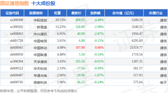 证券之星消息,11月11日,国证通信(399389)指数报收于7060.14点,跌2.21%,成交915.47亿元,换手率1.19%。当日该指数成份股中,上涨的有17家,仕佳光子以7.07%的涨幅领涨,下跌的有51家,天孚通信以8.01%的跌幅领跌。
