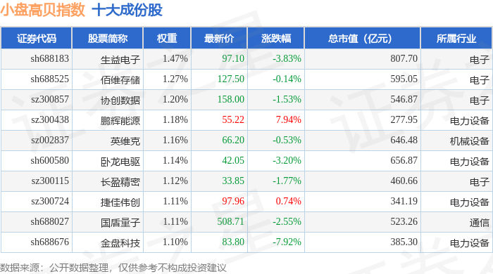 证券之星消息,11月11日,小盘高贝(399409)指数报收于6280.08点,跌0.77%,成交1254.58亿元,换手率3.58%。当日该指数成份股中,上涨的有45家,鹏辉能源以7.94%的涨幅领涨,下跌的有101家,金盘科技以7.92%的跌幅领跌。