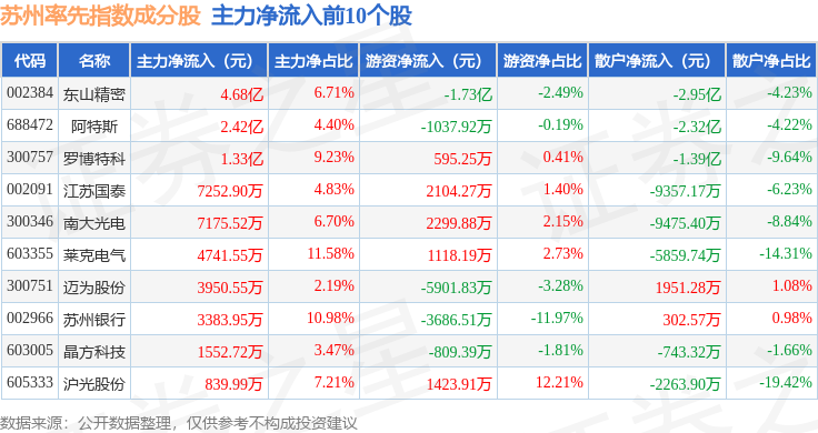 资金流向方面,苏州率先(399410)指数成份股当日主力资金净流出合计1.82亿元,游资资金净流入合计3.52亿元,散户资金净流出合计1.7亿元。成份股资金流向详情见下表: