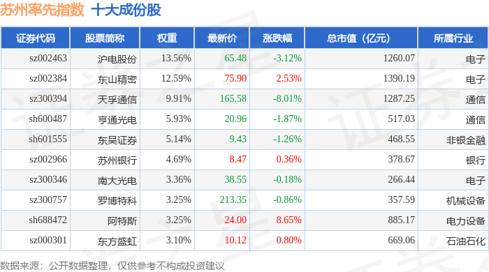 证券之星消息,11月11日,苏州率先(399410)指数报收于2723.18点,跌0.74%,成交438.58亿元,换手率2.75%。当日该指数成份股中,上涨的有14家,阿特斯以8.65%的涨幅领涨,下跌的有15家,天孚通信以8.01%的跌幅领跌。