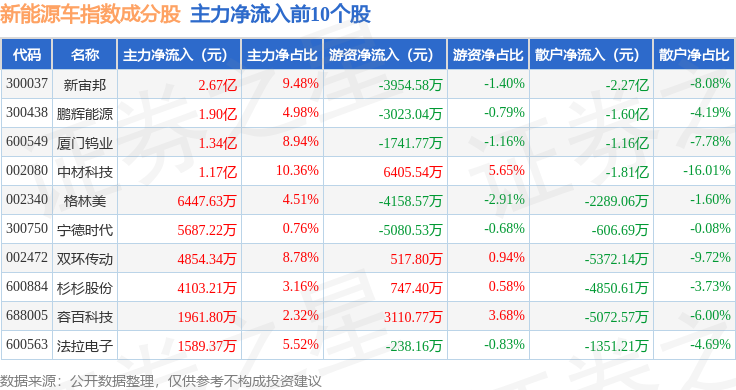 资金流向方面,新能源车(399417)指数成份股当日主力资金净流出合计72.47亿元,游资资金净流入合计9.84亿元,散户资金净流入合计62.63亿元。成份股资金流向详情见下表: