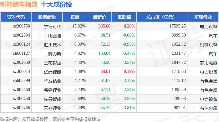 证券之星消息,11月11日,新能源车(399417)指数报收于3932.23点,跌0.96%,成交1144.07亿元,换手率3.62%。当日该指数成份股中,上涨的有15家,鹏辉能源以7.94%的涨幅领涨,下跌的有34家,天齐锂业以3.81%的跌幅领跌。