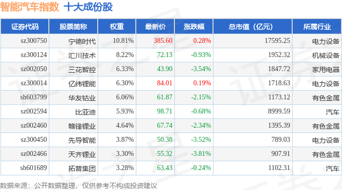 证券之星消息,11月11日,智能汽车(399432)指数报收于6610.58点,跌1.08%,成交757.84亿元,换手率2.77%。当日该指数成份股中,上涨的有14家,新宙邦以5.25%的涨幅领涨,下跌的有36家,天齐锂业以3.81%的跌幅领跌。