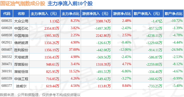 资金流向方面,国证油气(399439)指数成份股当日主力资金净流出合计2.84亿元,游资资金净流入合计1.29亿元,散户资金净流入合计1.55亿元。成份股资金流向详情见下表: