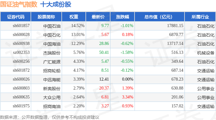 国证油气(399439)指数十大成份股详情如下: