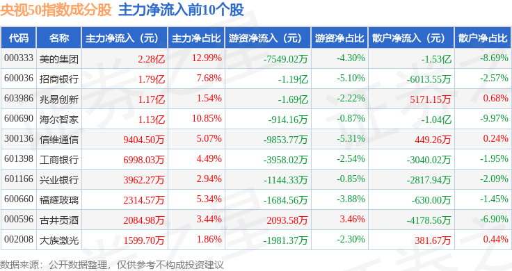 资金流向方面,央视50(399550)指数成份股当日主力资金净流出合计8.59亿元,游资资金净流入合计3.35亿元,散户资金净流入合计5.25亿元。成份股资金流向详情见下表: