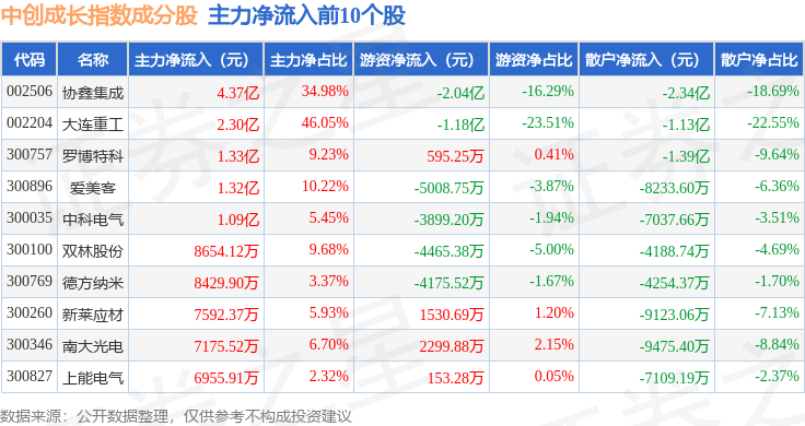 资金流向方面,中创成长(399626)指数成份股当日主力资金净流出合计118.38亿元,游资资金净流入合计20.23亿元,散户资金净流入合计98.15亿元。成份股资金流向详情见下表:
