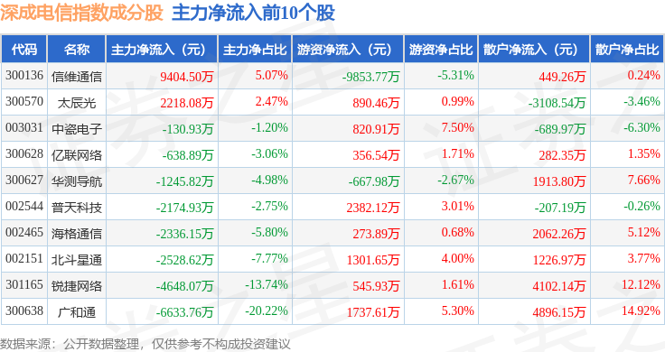 资金流向方面,深成电信(399688)指数成份股当日主力资金净流出合计30.25亿元,游资资金净流入合计13.91亿元,散户资金净流入合计16.34亿元。成份股资金流向详情见下表: