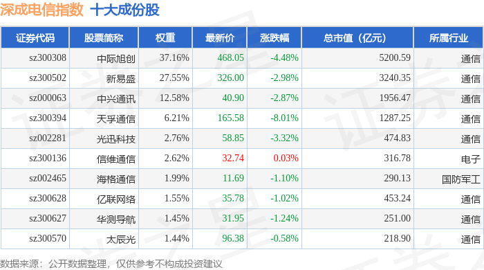 证券之星消息,11月11日,深成电信(399688)指数报收于5391.13点,跌3.61%,成交496.96亿元,换手率3.06%。当日该指数成份股中,上涨的有2家,普天科技以0.98%的涨幅领涨,下跌的有13家,天孚通信以8.01%的跌幅领跌。