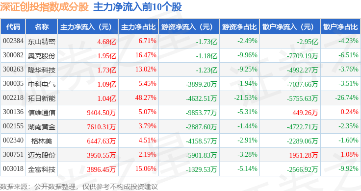 资金流向方面,深证创投(399696)指数成份股当日主力资金净流出合计44.86亿元,游资资金净流入合计5.02亿元,散户资金净流入合计39.83亿元。成份股资金流向详情见下表: