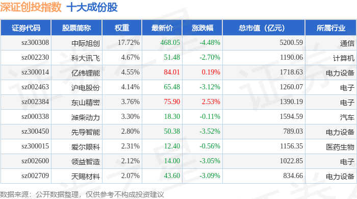 深证创投(399696)指数十大成份股详情如下: