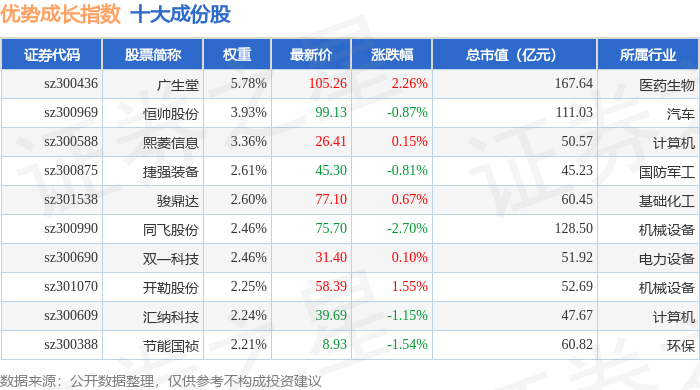 证券之星消息,11月11日,优势成长(399698)指数报收于52274.99点,跌0.04%,成交95.13亿元,换手率2.13%。当日该指数成份股中,上涨的有27家,壶化股份以6.9%的涨幅领涨,下跌的有22家,易天股份以5.5%的跌幅领跌。