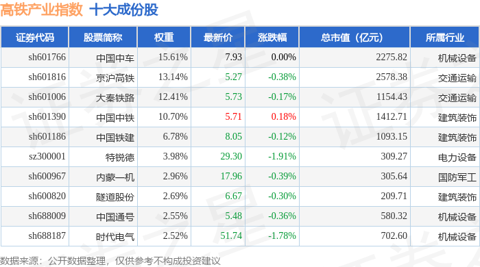 证券之星消息,11月11日,高铁产业(399807)指数报收于1333.48点,涨0.06%,成交107.97亿元,换手率0.86%。当日该指数成份股中,上涨的有24家,神州高铁以10.0%的涨幅领涨,下跌的有19家,新筑股份以2.98%的跌幅领跌。
