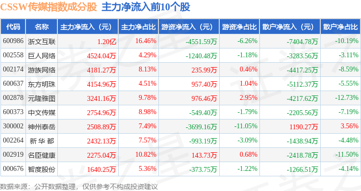 资金流向方面,CSSW传媒(399810)指数成份股当日主力资金净流出合计21.69亿元,游资资金净流入合计2.74亿元,散户资金净流入合计18.95亿元。成份股资金流向详情见下表: