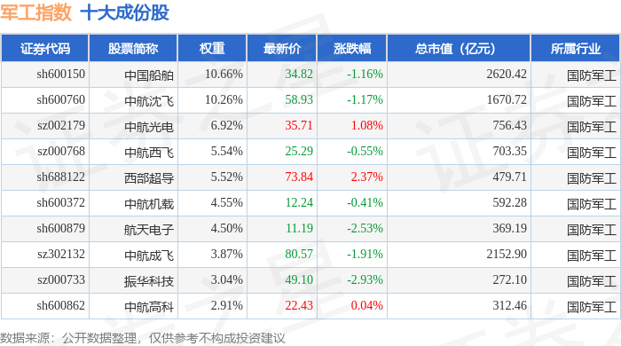 证券之星消息,11月11日,军工指数(399959)报收于1587.81点,跌0.69%,成交175.96亿元,换手率1.36%。当日该指数成份股中,上涨的有12家,西部超导以2.37%的涨幅领涨,下跌的有28家,航天智装以5.48%的跌幅领跌。