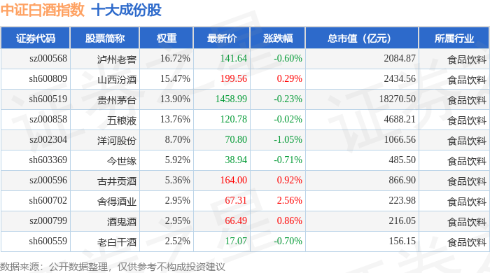 证券之星消息,11月11日,中证白酒(399997)指数报收于10040.1点,跌0.13%,成交174.53亿元,换手率1.25%。当日该指数成份股中,上涨的有8家,舍得酒业以2.56%的涨幅领涨,下跌的有11家,水井坊以1.13%的跌幅领跌。