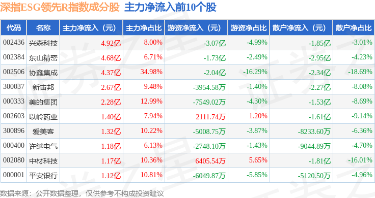 资金流向方面,深指ESG领先R(470029)指数成份股当日主力资金净流出合计154.65亿元,游资资金净流入合计33.42亿元,散户资金净流入合计121.22亿元。成份股资金流向详情见下表: