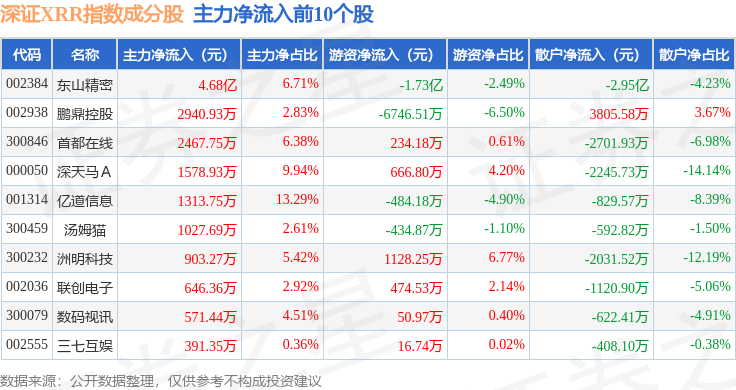 资金流向方面,深证XRR(470046)指数成份股当日主力资金净流出合计40.99亿元,游资资金净流入合计5.82亿元,散户资金净流入合计35.17亿元。成份股资金流向详情见下表: