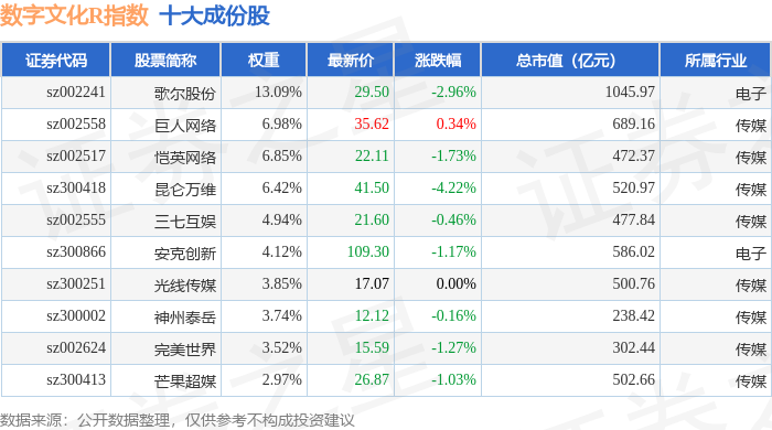 资金流向方面,数字文化R(470047)指数成份股当日主力资金净流出合计17.32亿元,游资资金净流入合计2.75亿元,散户资金净流入合计14.58亿元。成份股资金流向详情见下表: