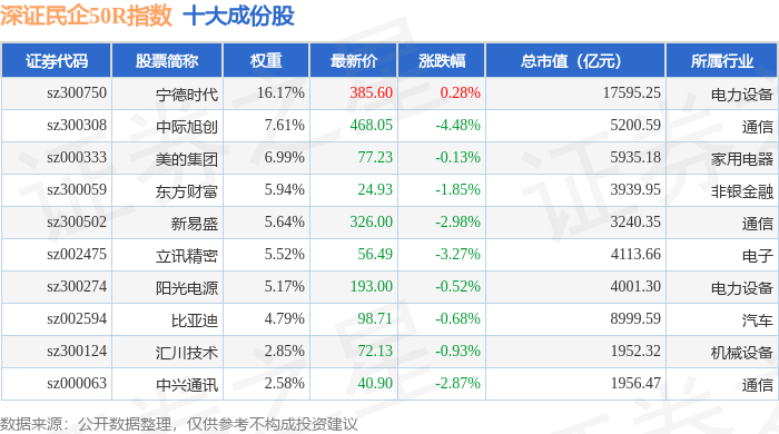 证券之星消息,11月11日,深证民企50R(470057)指数报收于3884.17点,跌1.52%,成交1436.61亿元,换手率1.71%。当日该指数成份股中,上涨的有13家,万丰奥威以2.94%的涨幅领涨,下跌的有37家,天孚通信以8.01%的跌幅领跌。